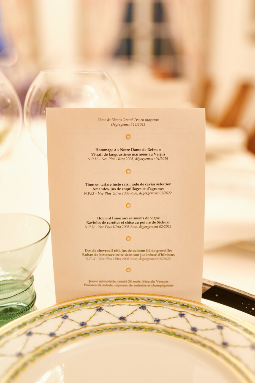 Lors d’un dîner donné au sein même de la résidence privée de Bruno Paillard, l’ancien président, légende vivante de la Champagne, en compagnie de sa fille Alice qui lui a succédé à la présidence, a rappelé les principes fondateurs de la cuvée NPU, née sur un bout de papier de la provocation de journalistes anglais. « « Nec Plus Ultra », ce n’est pas un terme marketing, c’est un engagement, celui de ne proposer à chaque étape que le meilleur. Il existe des cuvées de prestige multi vintages, pour notre part, nous aimons l’idée que chaque millésime puisse aussi avoir sa vie. En revanche, nous ne prenons que les très grandes années, ici 2008. Pour les raisins, nous nous cantonnons aux grands crus. Certains endroits en premiers crus sont tout aussi qualitatifs, mais si on prend une règle on ne transige pas ! Troisièmement, que la première presse. Les amers en Champagne, ce sont les tailles, n’en déplaise à cette nouvelle mode journalistique qui en chante les louanges… Ajoutez une vinification en fût, une maturation d’au moins dix ans et enfin un dosage en extra brut, parce qu’avec un tel vieillissement, tout est tellement fondu que le sucre est presqu’inutile. »
